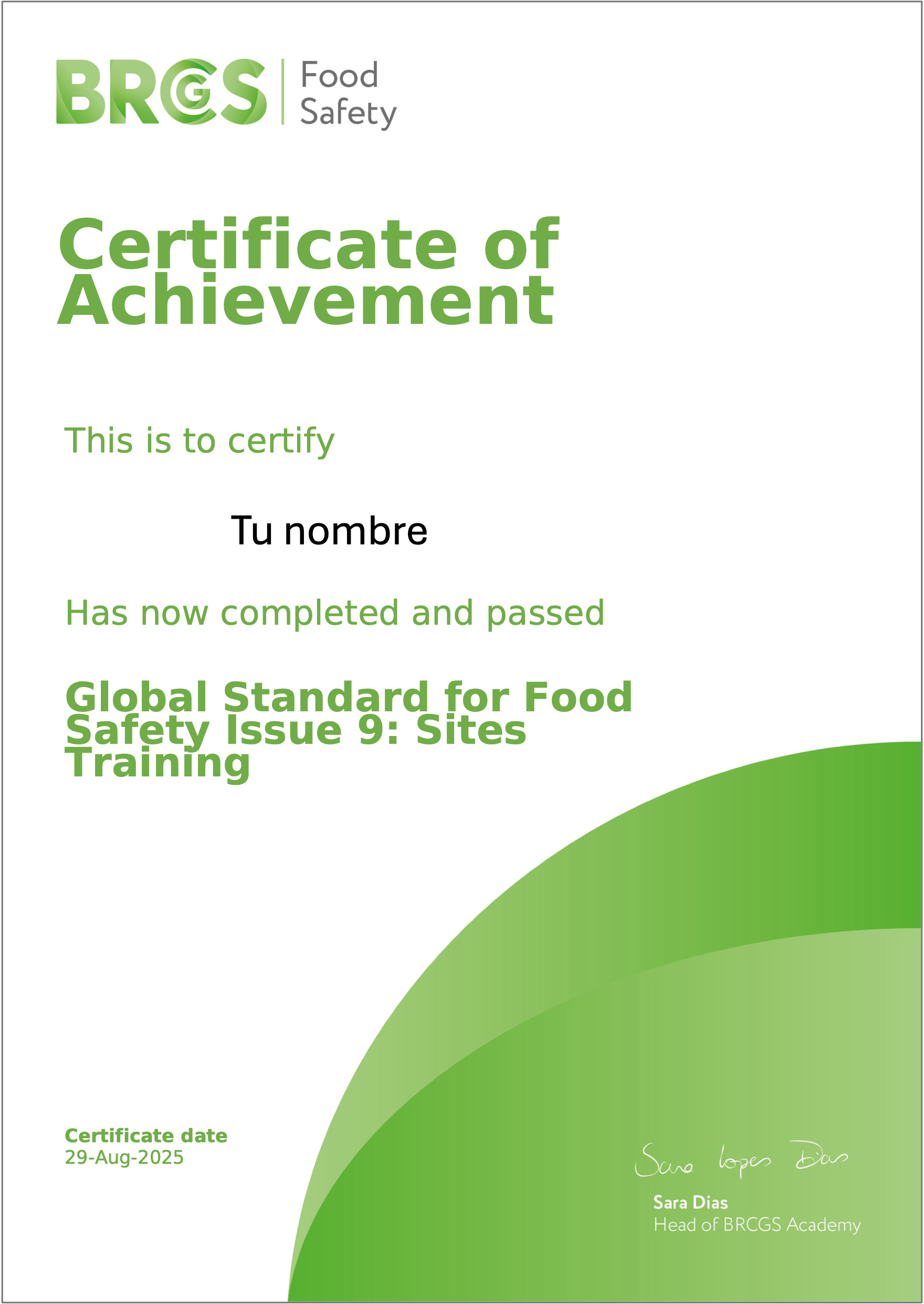 El curso es oficial, lo que incluye la emisión de certificados desde BRCGS, después de aprobar la prueba de 25 preguntas en BRCGS Educate (aprueban con 60% al menos)